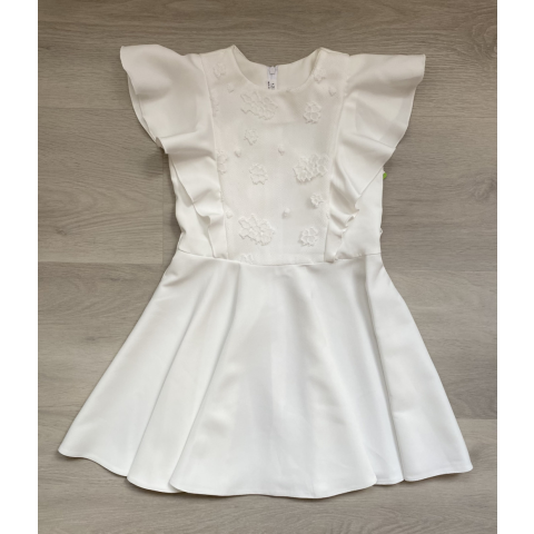 Rövid, fodrosujjú, tört fehér egész lány ruha. Hátul cipzáros, ami segíti könnyebb fel- és levételt. A felső részén csipke díszítés található. Mindig a pontos centiméter adatok alapján való méretválasztást javaslom! Teljes hossz: 77 cm Szélesség: 32 cm