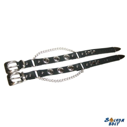 Valódi marhabőrből csizmapánt. Sheriff csillag díszekkel, acél lánc dísszel, galván csatokkal és vég díszekkel. Szélesség: 2,5cm Teljes hossz 43cm, 33-39cm közt állítható. 1 pár!