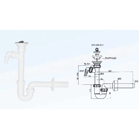 STYRON csőszifon 32mm átmérővel, mosógép csatlakozóval, leeresztővel.