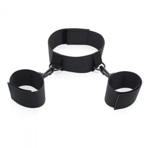 Három részes kötözőkészlet, melyben egy nyakörv és két hozzá műanyag, oldható karabínerekkel csatlakozó csuklókötöző található. Erős nylon anyagból készültek és tépőzárral állíthatók méretre. Anyaga: nylon, műanyag