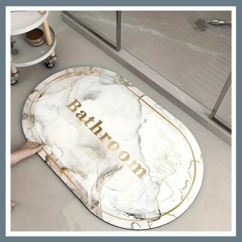 Csúszásmentes fehér fürdőszobai szőnyeg - Ovális, elegáns minta 601099648860503Varázsold különlegessé fürdőszobádat ezzel az elegáns, ovális formájú fürdőszobai szőnyeggel, amely stílusos „bathroom” felirattal és exkluzív arany márvány mintával díszített. A szőnyeg fehér alapszíne letisztult, modern megjelenést kölcsönöz, míg a csúszásgátló hátoldal biztonságos használatot biztosít a nedves padlón is. Kiváló választás azok számára, akik eg