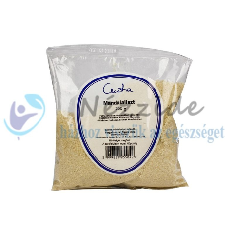 Mandulaliszt. Tápérték 100g termékben: Energia 1185,2g / Kalória 282,4g Zsír 12g Fehérje 36,4g Szénhidrát 7,2g Rost 25,9g Felhasználása: Önmagában, vagy más lisztekkel keverve sütéshez, főzéshez, sűrítéshez, kekszek, krémek készítéséhez.Tárolás: Sz