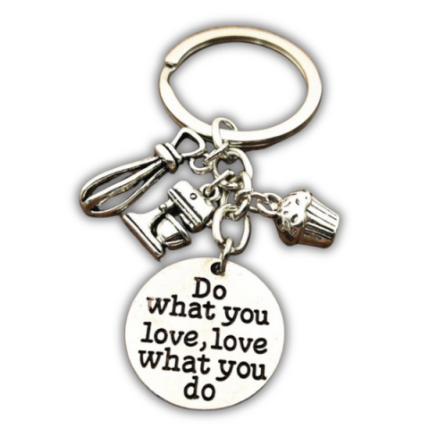 Egyedi cukrász kulcstartó négy medállal: robotgép, habverő, muffin "Csináld amit szeretsz, szeresd amit csinálsz" felirattal