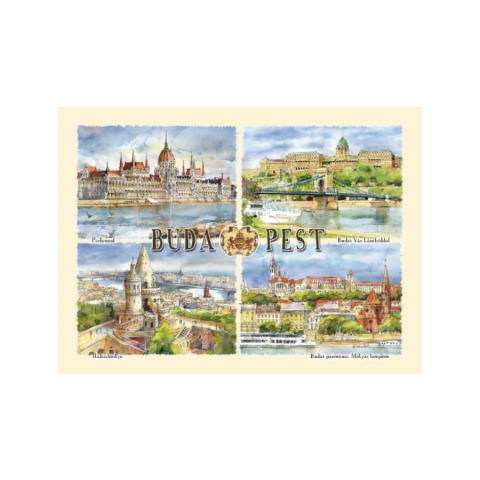 Budapest képeslap: Látványos városnézés egy pillanat alatt 🇭🇺 Ez a gyönyörű képeslap négy ikonikus budapesti látnivalót mutat be: a Parlament épületét, a Budai Várat, a Halászbástyát és a Lánchidat. Élénk színei és részletgazdag képei tökéletes ajánd...
