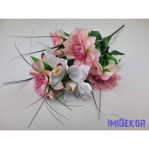Dália-Orchidea 7 ágú selyem csokor fűszálakkal 49cm - Rózsaszín
