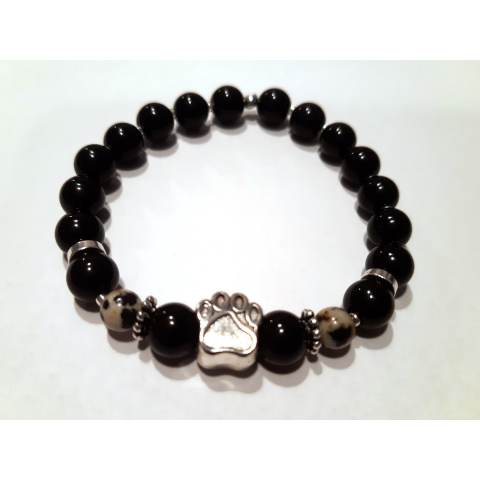 A divatos fényes fekete onyx kövek, és Dalmata jáspis és a fém tappancs díszítő elemek kombinációja minden barátod irigységét kelti! A gyöngyöket összetartó gumidamil erős és rugalmas. A gyöngyök átmérője körülbelül 8 mm.Féldr