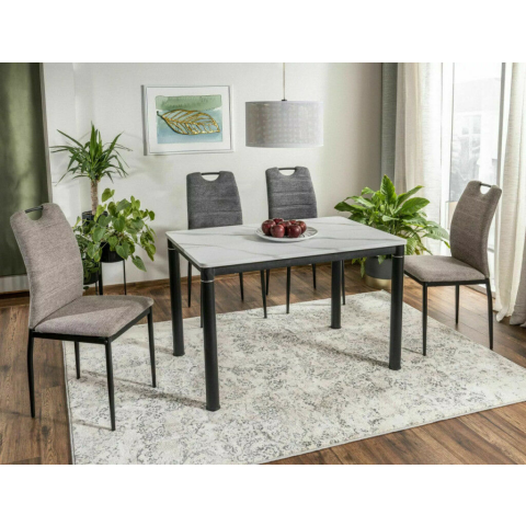 Modern étkezőasztal márvány hatású MDF lappal és matt fekete fém lábszerkezettel. Tökéletes választás 4 személy számára, elegáns megjelenésével stílusos kiegészítője lehet az étkezőnek. Elegáns márványhatású étkezőasztal modern otthonokba A Damar...