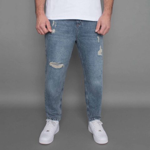 Tapered Fit, laza szabású kék farmer, szaggatott, enyhén ülepes lefele szűkülő fazon, elől-hátul zsebbel, cipzáros sliccel Modell: 185 cm/ 85 kg/ 33-as méret