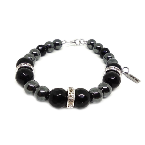 Figyelem! Nem szakad, nem nyúlik! Tartós ékszer. Az ékszer ásványai és tartozékai: – 8 és 10 mm-es fazettált fekete ónix achát gyöngyök – 8 mm-es fekete hematit ásvány gyöngy – Ezüst színű strasszos díszek – M.King márkajelz