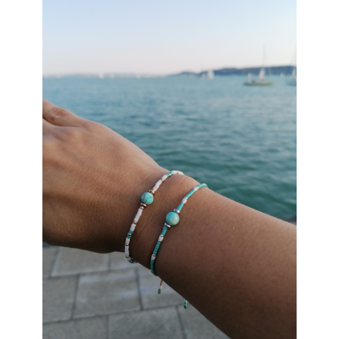 DASY Blue karkötő, a kifinomult stílus kedvelőinek. Egyedi kézzel készített nyàri minimál karkötő. A karkötő magas minőségű Miyuki és Delica gyöngyök és Türkenit felhasználásával készült. Mérete állítható. Türkenit gyöngy mérete : 6mm A gyöngy