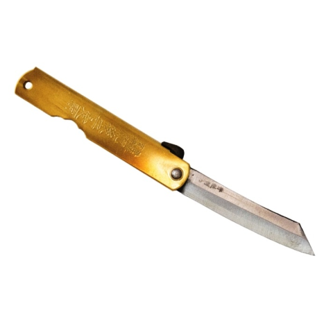 Nagao Higonokami - DB100Közepes méretű tradícionális japán zsebkés, amely annak ellenére, hogy nem rendelkezik zárral, több dologra képes, mint amit el tudunk képzelni. Kézi megmunkálással készül, markolata hajtogatott réz, melyet kanjis-sal (japán ír