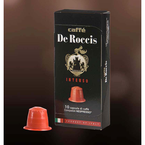 Caffé De Roccis Intenso prémium minőségű klasszikus olasz keverék testes és gazdag ízzel Nespresso kapszulás kávéfőzőkhöz.Ugandai robuszta: testes kávés, sűrű és gazdag textúrával. Erős és tartós aroma, kellemes csokoládés illat.