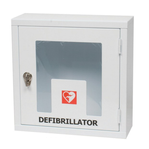 - defibrillátor tároló fali kabin - beltéri használatra - külső méret: 42,5x16x42,5 cm - belső méret: 40x13x40 cm - fehér fém ház - fehér - nyitáskor riaszt hanggal: 100 dB - lakattal is zárható - előlről áttetsző üveggel és defibrillátor jellel - 3 válas