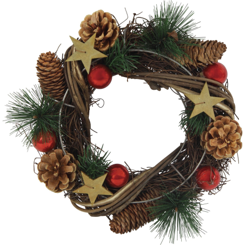 A dekor-koszorú átmérője 25 cm, mélysége 8 cm, és kiváló minőségű természetes anyagokból készült. Tökéletes az ajtóra vagy dekoratív elemként az asztalra. A karácsonyi koszorú természetes megjelenésével hívogató és ünnepi hangulatot teremt. Időtlen kialakítása harmonikusan illeszkedik bármilyen karácsonyi dekorációhoz, és egy kis természetet visz otthonába.