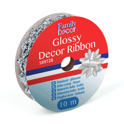 Dekor szalag - fényes - 2,74 m - ezüst Alkalmas lehet virágok, ajándékok kötésére vagy egyedi, kreatív dekorációk készítésekor. A szalag hajlékony, jól formázható, korlátozottan nyúlik. A csillogó színek egyedi és vidám megjelenést kölcsönöznek ajándék