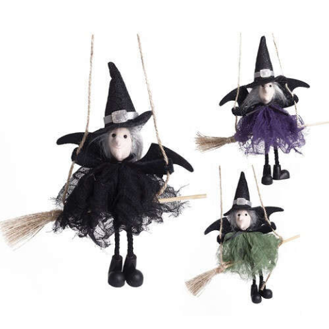 Dekor textil boszorkány akasztós seprűvel 21 cm többféle