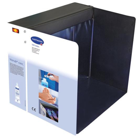 UV-lámpa a higiénés kézfertőtlenítés technikájának ellenőrzésére, monitorozására, fejlesztésére Hordozható UV-lámpa, mely praktikusan kis méretre összecsukható. Visirub fluoreszcens oldattal együtt használható a kézfertőtlenítési technika ellenőrzésére