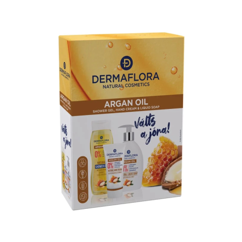 A csomag tartalma: Dermaflora Natural Cosmetics 0% Argan oil&honey folyékony szappan Dermaflora Natural Cosmetics 0% Argan oil&honey kézkrém Dermaflora Natural Cosmetics 0% Argan oil&honey tusfürdő