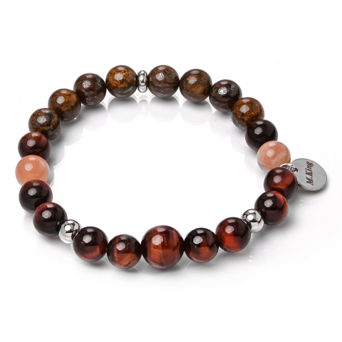 RUGALMAS KARKÖTŐ, a mérete választható.Az ékszer ásványai és tartozékai:– 10 és 8 mm-es vörösesbarna tigrisszem gyöngyök– 8 mm-es napkő gyöngyök– 8 mm-es bronzit gyöngyök– Ezüst színű díszek– M.King márkajelzésű