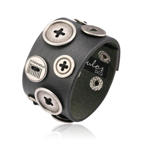 Egyedi, kézzel készült bőr ékszer, gombokkal díszítve. Minden darab más és más, így nem láthatsz ugyanilyen ékszert máson. Ez csak Neked lesz meg egyedül!