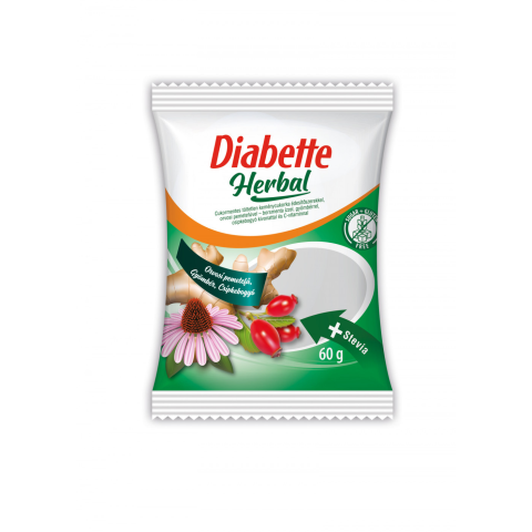 Diabette HERBAL gyömbér, csipkebogyó, orvosi pemetefű cukorka 60 g Diabette cukormentes töltetlen keménycukorka édesítőszerekkel, orvosi pemetefűvel -borsmenta ízzel, gyömbérrel, csipkebogyó kivonattal és C-vitaminnal.