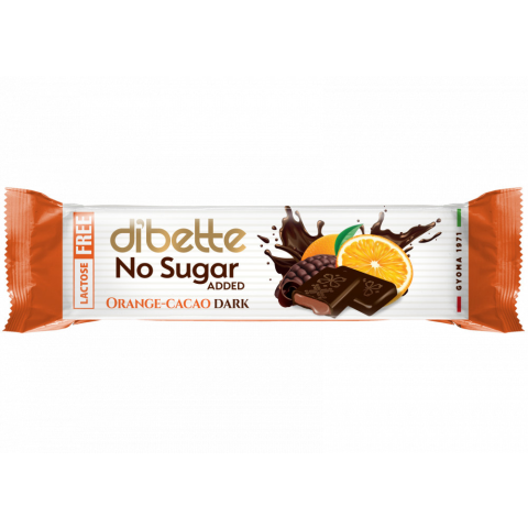 DIBETTE NSA Narancs ízű kakaós krémmel töltött étcsokoládé szelet hozzáadott cukor nélkül, édesítőszerekkel, 22 g Laktózmentes Összetevők: étcsokoládé 65% (kakaómassza, édesítőszer: eritrit, szteviol-glikozidok (0,02%), kakaóvaj, emulgeálószerek: napr