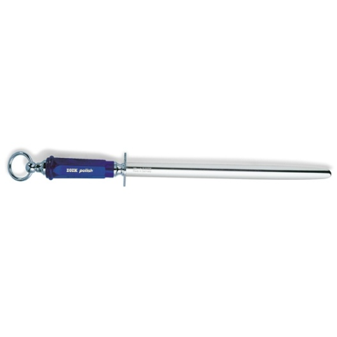 Hosszúság: 30cm Polír fenőacél alapfelszerelés a hentesek körében finom élezésre azaz polírozásra használják a könnyebb siklás érdekében Acél szerkezet Polírozott szabás Ovális alakzat Kék műanyag fogantyú Ujjvédő Akasztó horog Németországban készült Te