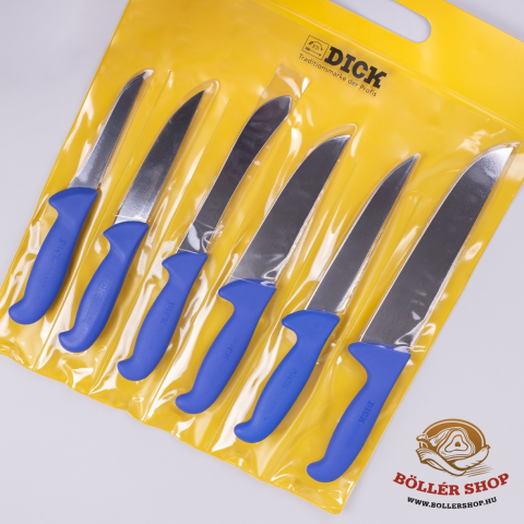 Dick késkészlet, hentes kés szett Tartalom: Csontozó kés: 13 cm-es Szúró kés: 15 cm-es Nyúzó kés: 18 cm-es Szúró kés: 18 cm-es Aprító kés: 18 cm-es Aprító kés: 23 cm-es Ezekhez a késekhez igazi nagymenő fenőacél illik a Dick Titan fenőacél durva speciál