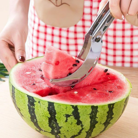 Használata: A félbevágott dinnye belsejét szeletelje fel a szeletelővel. Fordítsa meg a szeletelőt, enyhén összenyomva fogja meg vele a dinnyeszeletet, és emelje ki.