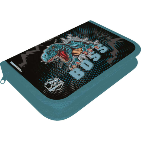 Dino Cool tolltartó, klapnis, üres, 19x13x4cm, Boss. Varrott, textil tolltartó, erős cipzárral, két kihajthatófüllel, töltés nélkül. 27 + 3 gumis bújtató az írószerek és egyéb kiegészítők számára, 2 műanyag zseb, órarend.
