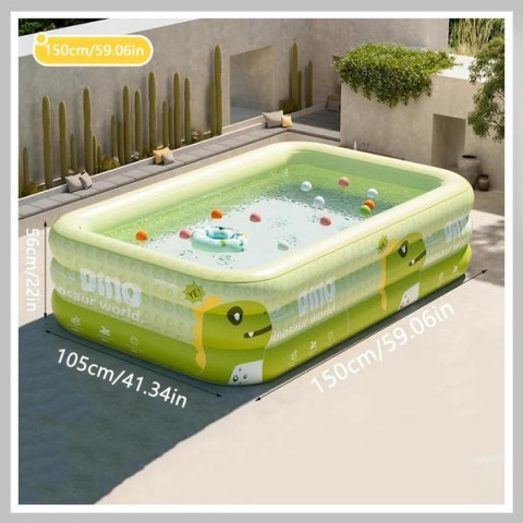 Dínó mintás felfújható gyerek medence 105 x 150 cm AU2094412Változtasd a kertet őskori kalandparkká ezzel a dinoszaurusz témájú felfújható medencével! A 105 x 150 cm-es méretének köszönhetően bőven jut hely pancsolásra és játékra a legkisebbeknek is. A strapabíró PVC anyagból készült medence tartós, mégis könnyen összecsukható és hordozható, így egyszerűen tárolható és szállítható.Ez a többfunkciós játszótér nem csupán egy medence – a dinoszaur