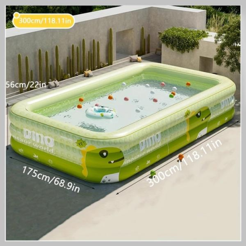 Dínó mintás felfújható gyerek medence 175 x 300 cm AU2094412-2Változtasd a kertet őskori kalandparkká ezzel a dinoszaurusz témájú felfújható medencével! A 175 x 300 cm-es méretének köszönhetően bőven jut hely pancsolásra és játékra a legkisebbeknek is. A strapabíró PVC anyagból készült medence tartós, mégis könnyen összecsukható és hordozható, így egyszerűen tárolható és szállítható.Ez a többfunkciós játszótér nem csupán egy medence – a dinosza