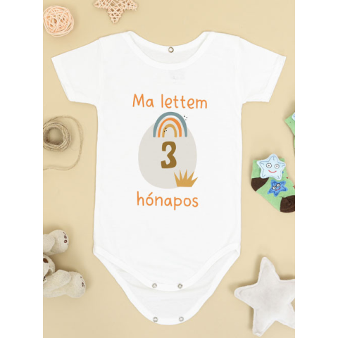 Baba ajándék, dínós body babáknak, 3 hónapos lettem body. 3 hónap, 3-szor annyi szeretet! Ez a fehér, pamut, rövid ujjú body aranyos dínós grafikával és „Ma lettem 3 hónapos” felirattal tökéletes ajándék minden kisbaba számára. Ha valami igazán különleges