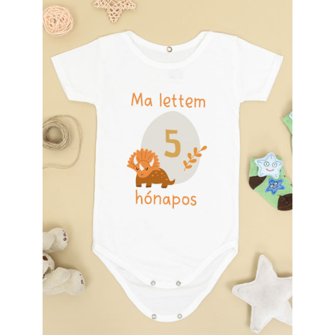 Baba ajándék, dínós body babáknak, 5 hónapos lettem body. Az 5 hónap gyorsan elrepült – örökítsd meg ezt a pillanatot egy stílusos és kényelmes bodyval! A cuki dinoszaurusz motívum és a „Ma lettem 5 hónapos” felirat tökéletes választás babafotózáshoz, és