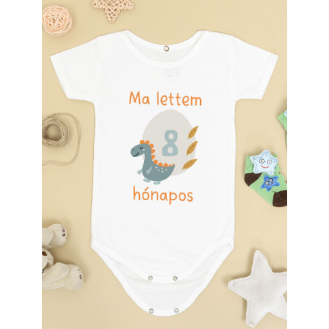 Baba ajándék, dínós body babáknak, 8 hónapos lettem body. Ez a dínós baba body tökéletes választás, ha szeretnéd megünnepelni a nyolcadik hónapot egy különleges, feliratos ajándékkal. A „Ma lettem 8 hónapos” minta aranyos és figyelemfelkeltő, így kiválóa