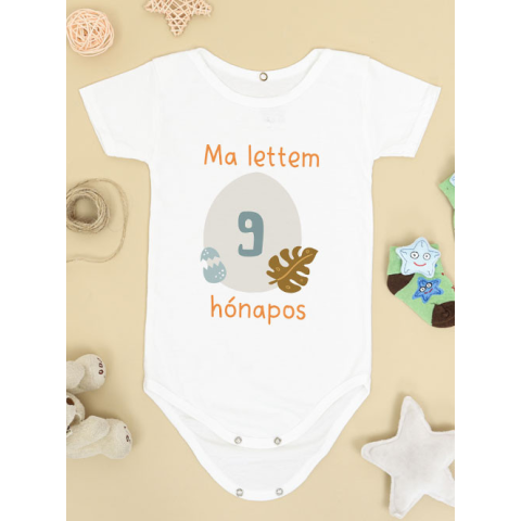Baba ajándék, dínós body babáknak, 9 hónapos lettem body. A kilencedik hónap is egy nagy lépés – örökítsd meg egy különleges dinoszauruszos bodyval! A „Ma lettem 9 hónapos” felirat segít megőrizni az emlékeket, a body puha pamut anyaga pedig kényelmes vis