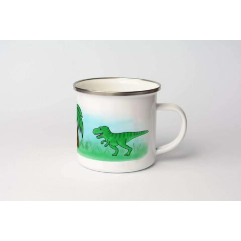 Zománcozott fém bögre dinoszauruszos mintával, amely felirattal névre szólóvá is tehető.A fém anyag miatt mikrohullámú sütőbe nem tehető be. Mosogatógépben tisztítható.