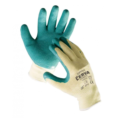 Pamut/poliészter keverékből készült, természetes latexbe félig mártott, kötött, varratmentes kesztyű csúszásgátló kikészítésű tenyérrel és ujjakkal, valamint rugalmas kötött mandzsettával. Méretek: a női 8 (zöld), a férfi 10 (szürke)
