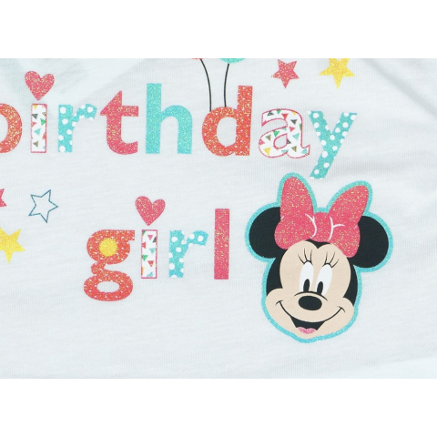 Ünnepelje kislánya születésnapját ezzel a cukiságot sugárzó, Minnie egérrel díszített Disney kombidresszel! A rövid ujjú baba body fehér színben pompázik, amin a Minnie egér rajzfilmfigura és a csillogó 'birthday girl' felirat teszi igazán különlegessé ez