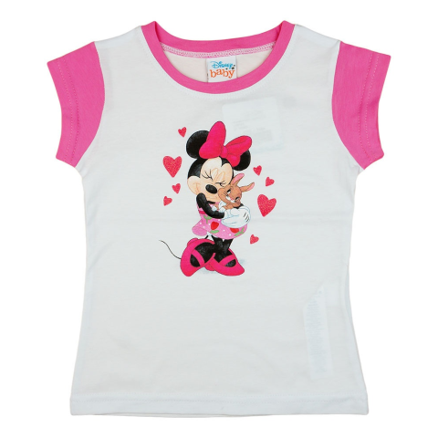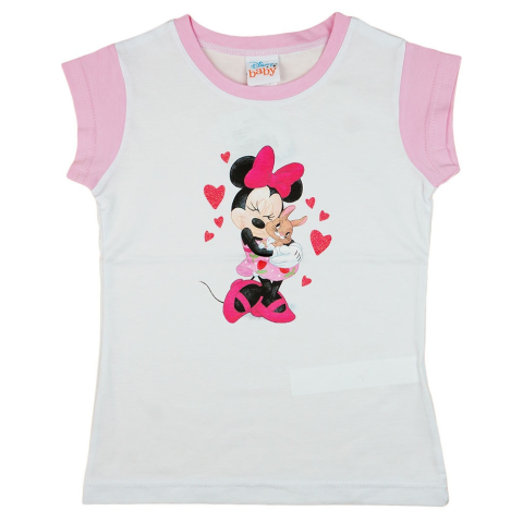 Tündéri rózsaszínű, rövid ujjú póló, amely minden kislány kedvence lesz! A magas minőségű, 100% pamut anyag garantálja a kényelmet és a tartósságot. A póló cuki Minnie egér mintával van díszítve, amely a Disney rajzfilmekből is ismert és nagyon szeretett