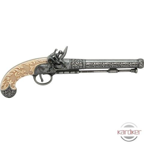 Kovás díszpisztoly működő mechanikával. Lövés leadására nem alkalmas, csak dekorációs tárgy. Kovás díszpisztoly működő mechanikával. Lövés leadására nem alkalmas, csak dekorációs tárgy. Dísz pisztoly 64137 - specifikáció: Anyaga: fém és szintetikus