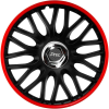 Fekete-piros színű, görbített küllős sportos dísztárcsa készlet, mely nem csak egyedivé teszi az autó külsejét, de védi a felni a kisebb sérülésektől. Strapabíró ABS műanyagból készült, mely ellenáll az időjárás viszontagságainak. Jól bírja a sót, az UV sugárzását, a savas esőt. Felületét dupla lakkréteg védi. A dísztárcsa szett nem autótípus függő, kizárólag a kerék méretét kell tudni a használatához és lemezfelnivel szerelt autókhoz lehe