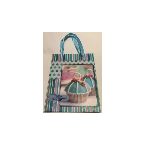 1 kép Dísztasak/ajándéktasak glitteres csíkos, pöttyös, muffin mintával szalagfüllel 18x23x9 cm UTOLSÓ DARABOK