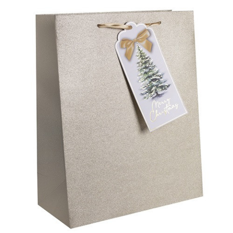 Dísztasak glitteres karácsonyi 26x32 cm arany kártyával 26x32 cm-es méretű dísztasak anyag: 210 g/ m2 súlyú papír formátum: álló felület: fényes szalag füles