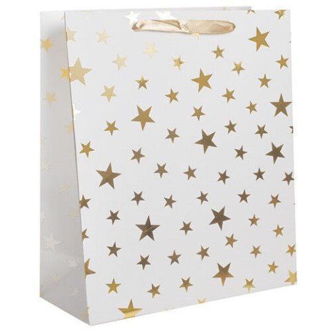 Csillagos Ajándéktasak - Elegáns csomagolás minden alkalomra! ✨ Ez a matt felületű, fehér alapon arany csillagokkal díszített ajándéktasak tökéletes választás, ha stílusosan szeretnéd átadni az ajándékot. Legyen szó születésnapról, névnapról, karácso...