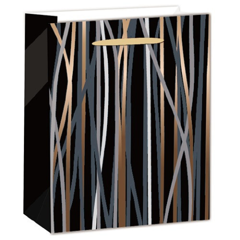 Elegáns, Matt Dísztáska - Fekete/Bronz Csíkos Mintával 🛍️ Ez a stílusos dísztáska tökéletes ajándékcsomagoláshoz vagy különleges alkalmakra. A matt felületű, 210 g/m2 súlyú papírból készült táska elegáns fekete alapon bronz és szürke csíkokkal díszít...
