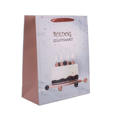 Boldog Születésnapot Dísztasak - Stílusos ajándékozás tortás dizájnnal! 🎂 Lepd meg szeretteidet ezzel a matt felületű, elegáns dísztasakkal, mely tökéletes választás születésnapi ajándékok átadásához. A tortás "Boldog Születésnapot" felirat...