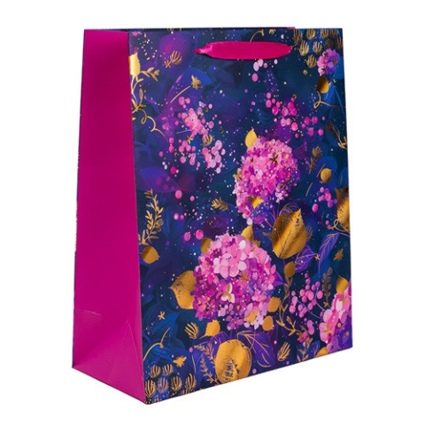 Dísztasak matt 18x23 cm lila/arany virágok 18x23 cm-es méretű dísztasak anyag: 210 g/ m2 súlyú papír formátum: álló felület: matt szalag füles