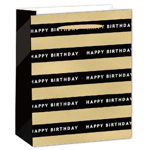 Dísztasak matt 26x32 cm fekete/arany Happy Birthday 26x32 cm-es méretű dísztasak anyag: 210 g/ m2 súlyú papír formátum: álló felület: matt szalag füles