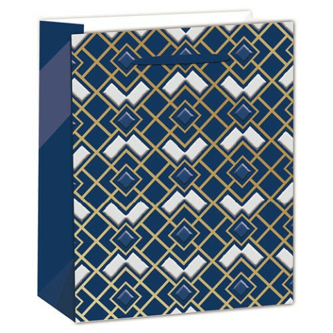 Dísztasak matt 26x32 cm arany/kék mintás 26x32 cm-es méretű dísztasak anyag: 210 g/ m2 súlyú papír formátum: álló felület: matt szalag füles